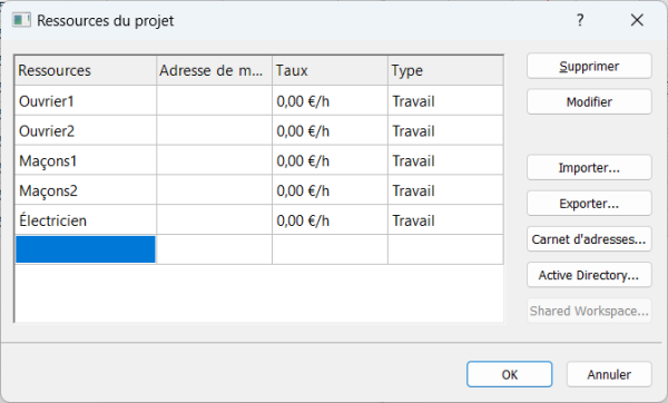 Bien que l’on puisse créer les ressources de type travail directement depuis le diagramme de Gantt, on ne peut que conseiller cette procédure aux risquent de créer des doublons. Les ressources se créent préférentiellement avec l’icône « Ressources du projet » ![]()