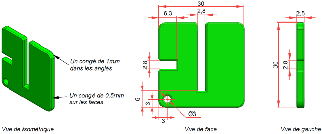 Remarquer que la côte de « 2,8 mm » tient compte de l’épaisseur d’une pièce de 2.5mm + un jeu de 0.3mm pour faciliter l’assemblage.