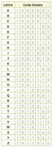 la lettre a minuscule se code en binaire : 110 0001 (Cf. tableau ci-dessous).