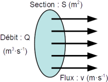 Le débit : \(\mathbf{{Q = S \times v}}\) avec \(\left\lbrace \begin{array}{lll} \text{Q : débit }(m^{3} \cdot s^{-1})\\ \text{S : surface, section de la conduite }(m^{2})\\ \text{v : vitesse linéaire du fluide }(m \cdot s^{-1}) \end{array} \right.\)