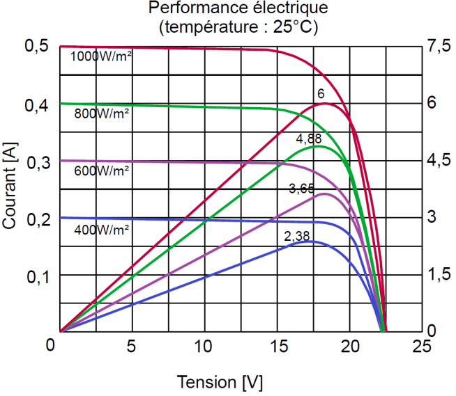 Q22 / Avec la caractéristique P = f (I), DÉTERMINER graphiquement la Puissance Maximale (PM ) fournie par le panneau solaire (Caractéristiques Q8).
