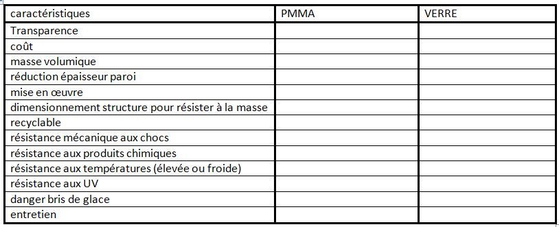 Q 08/ COMPARER les matériaux, verre « securit », et polycarbonate en fonction des caractéristiques précisées dans le tableau (avantage "1" et inconvénient "0").