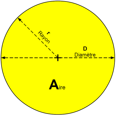 Aire (surface) d'un disque : \(\large{\textcolor{blue}{\mathbf{S = \pi \times \frac {D^{2}}{4}}}}\) avec \(\left\lbrace \begin{array}{lll} \text{S : surface du disque }( m^{2}) \\\text{D : diamètre du disque (m)} \\\text{r : rayon du disque (m)} \end{array} \right.\)