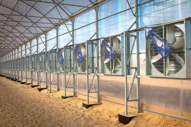 Afin de changer l’air de la serre tout en ajustant sa température et son hygrométrie, on est amené à effectuer une ventilation même en période de chauffage. On a déterminé que le débit moyen d’air nécessaire à la ventilation est de 0,005 m3·s-1 pour un m2 de surface au sol de la serre. Le volume de la serre est de 8869 m³.