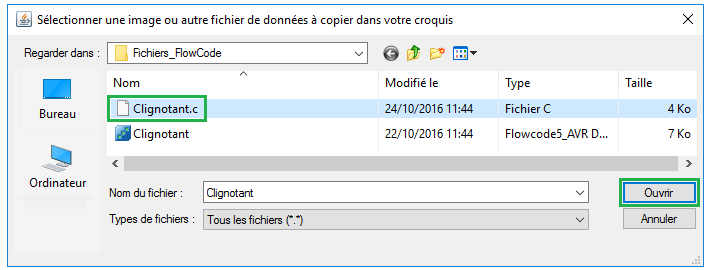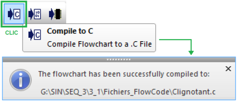 Une fenêtre apparaît, indiquant le succès de l'opération. Le fichier généré porte le même nom que l'algorigramme (fichier Flowcode) avec l'extension « .c ». Il est stocké dans le même répertoire de travail que le fichier Flowcode (extension « .fcf_avr »).