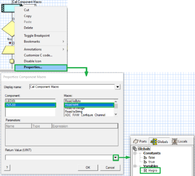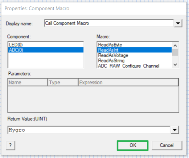 Le parallélogramme « Component Macro » permet de lire l'entrée analogique où sera connecté le capteur hygrométrique.