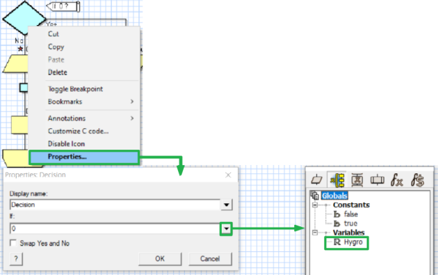 CLIQUER droit sur le losange « Decision » et OPTER pour « Properties ».