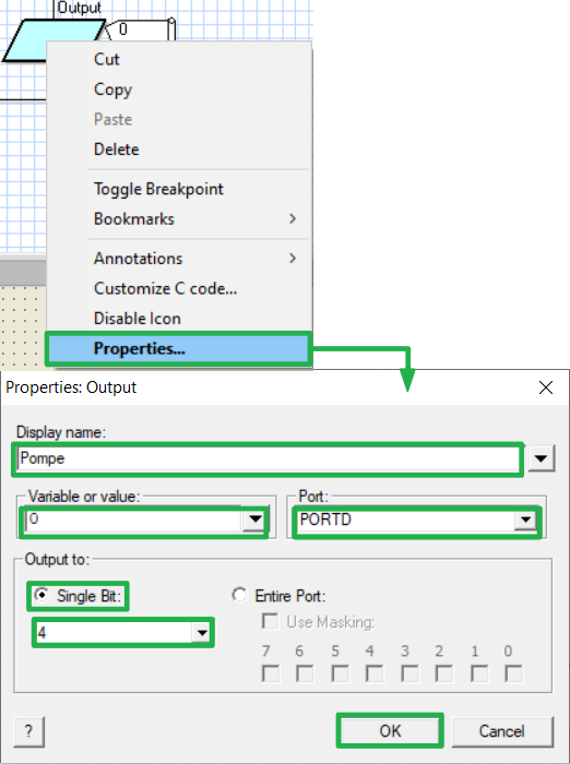 Dans le menu déroulant, CHOISIR le bit « 4 » puisque la pompe est connectée à la sortie « 4 » du port D.