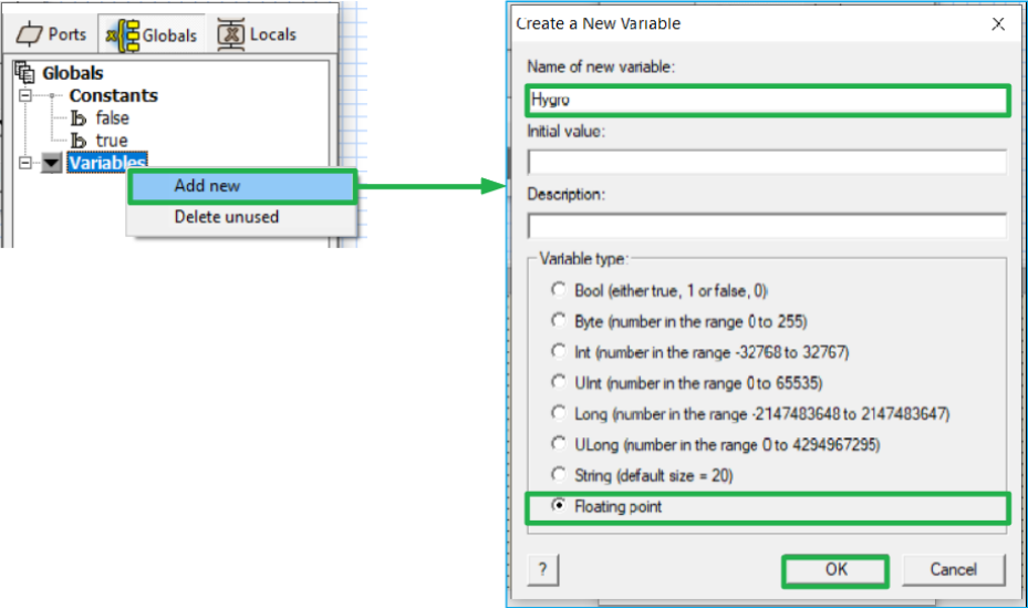 Dans la fenêtre « Variable type » SÉLECTIONNER « Floating point » pour déclarer une variable décimale.
