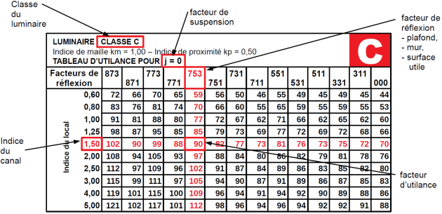 Le facteur d'utilance se détermine à l'aide de tableaux comportant trois variables :