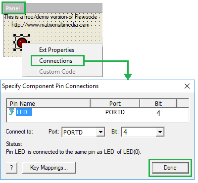 Dans la fenêtre « Panel ». CLIQUER droit sur la LED et OPTER pour « Connections».