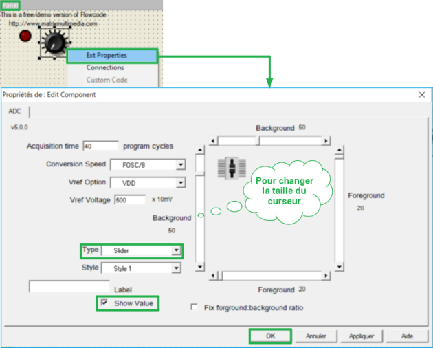Dans la fenêtre « Panel ». CLIQUER droit sur le potentiomètre et OPTER pour « Ext Properties ».