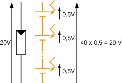 Si l'on souhaite fabriquer un module de cellules photovoltaïques permettant une alimentation de 20 V, il faut choisir de placer 40 cellules en série (20 / 0.5 = 40). Ces cellules en série forment une « string ». Il faut associer plusieurs « strings » en parallèle pour augmenter la puissance du panneau solaire.