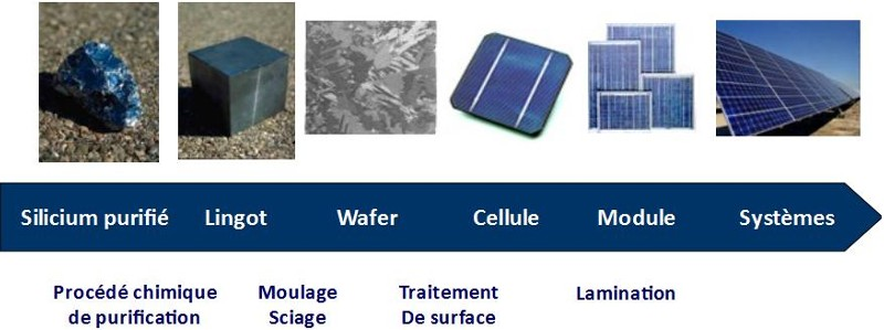 Les cellules sont la plupart du temps fabriquées à partir de silicium, matériau très courant dans la nature (On rencontre aussi le tellurure de cadmium en couche mince).