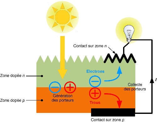 Dans une cellule photovoltaïque, il faut récupérer cette énergie pour créer de l'électricité. Pour cela on utilise une jonction PN. Une jonction PN est un semi-conducteur avec une couche dopée P et une couche dopée N. Le principe est de forcer les électrons et les trous à se diriger chacun vers une face opposée du matériau. Ainsi il apparaît une différence de potentiel et donc une tension entre les deux faces. La figure ci-contre représente ce fonctionnement.