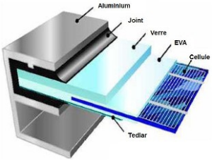La cellule solaire, unité de base d'un panneau solaire photovoltaïque, produit typiquement une puissance de 1,3 W pour une surface de 100 cm2. Pour produire plus de puissance, des cellules solaires identiques sont assemblées pour former un module solaire (ou panneau photovoltaïque). La mise en série de plusieurs cellules solaires somme les tensions pour un même courant, tandis que la mise en parallèle somme les courants en conservant la tension. La plupart des panneaux solaires photovoltaïques destinés à un usage général sont composés de 36 cellules en silicium mono ou polycristallin connectées en série pour des applications en 12 V nominal.