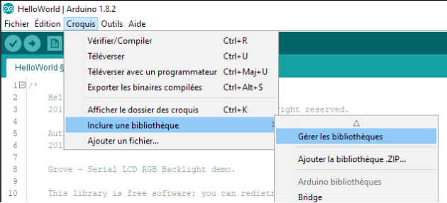 Ouvrir le gestionnaire de bibliothèque : Croquis \ Inclure une bibliothèque \ gérer les bibliothèques
