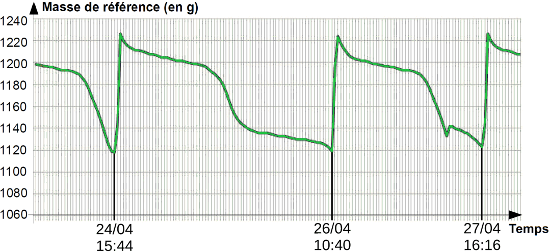 Une référence, composée d'une caissette remplie de substrat, est placée sur une balance afin de suivre l'évolution de sa masse tout au long de l'élevage. L'arrosage de l'ensemble de la serre est déclenché en fonction de la masse de cette référence.