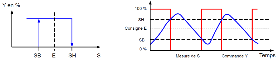 Contrainte d'étuvage : séchage des composants. La grandeur que I'on souhaite régler varie autour de son point de fonctionnement. Lorsqu'il y a dépassement des valeurs seuils de commutation, la sortie du régulateur change d'état. Dans certains cas, en raison de l'inertie du système à contrôler, la valeur absolue de l'erreur peut dépasser le seuil maximum.