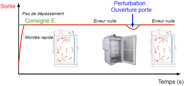 Lors de la mise en ouvre de l'étuve, le régulateur a réagi à l’ouverture accidentelle de la porte en rétablissant la température en 7 minutes. On peut constater que cela est dû au dépassement des 5 degrés autorisés. Il est nécessaire que le système bouclé regagne le plus rapidement sa situation d'avant la perturbation. Pour cela, nous devons mettre en œuvre une régulation proportionnelle.