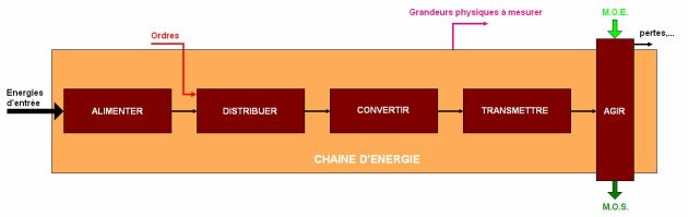 La chaîne d'énergie permet de remplir la fonction d'usage, c'est à dire d'agir sur la Matière d'œuvre Entrante (M.O.E.) de manière à lui ajouter de la valeur. En sortie, on y trouve donc la Matière d’Œuvre Sortante (M.O.S.), c'est à dire la M.O.E. + la V.A. (Valeur Ajoutée). Il peut aussi y avoir des pertes (chaleur, résidus, déchets...) ou des indésirables (bruit,...).