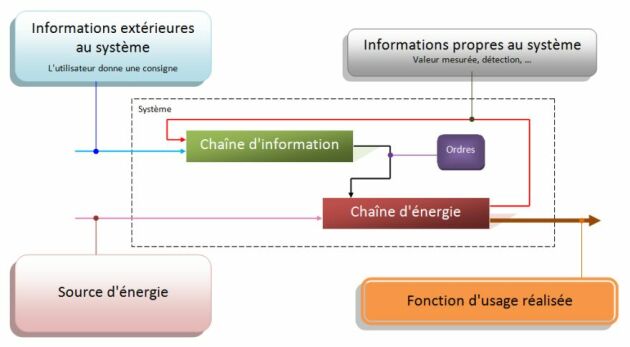 Des grandeurs physiques propres au système sont prélevées sur la chaîne d'énergie (détecteurs / capteurs), ce qui permet à la chaîne d'information de réagir en conséquence et, après traitement, d'envoyer à la chaîne d'énergie des ordres qui modifient l'action entreprise (exemple : mouvement stoppé par un détecteur fin de course).