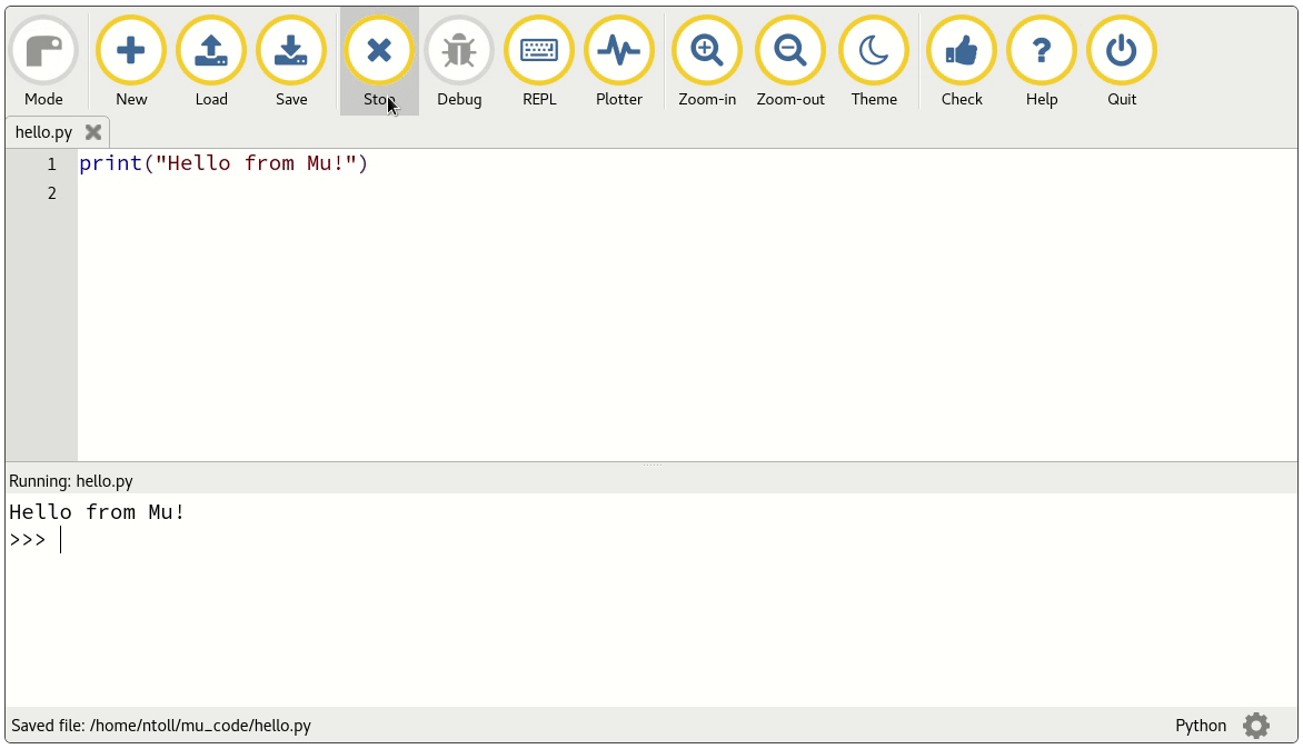 Pour la programmation sous MicroPython, nous utiliserons l'environnement Mu. Cet environnement et simple à utiliser et s'adapte à plusieurs types de cartes différents. Il est libre, gratuit et multi-plateforme.