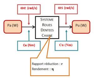 Un système roues dentées-chaîne peut être représenté par le schéma ci-contre :