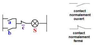 Cette représentation graphique utilise l'association de symboles de contacts électriques pour réaliser la fonction logique. La sortie est représentée par un voyant (allumé si S est au niveau logique « 1 »). Les variables complémentées (comme \(\bar c\)) sont représentées par un contact normalement fermé (fermé au repos).