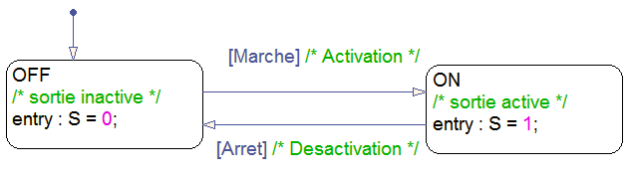 Dans l'exemple ci-dessus, réalisation d'une fonction marche/arrêt (2 entrées : Marche, Arret, une sortie : S) les deux états et les deux transitions sont commentés.
