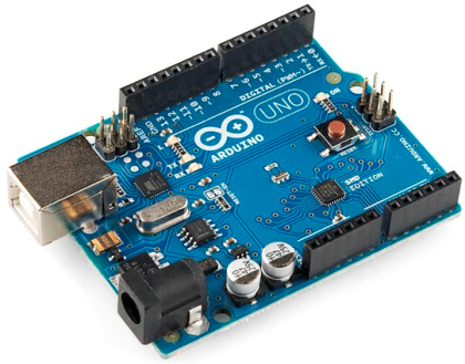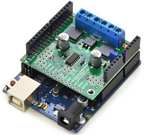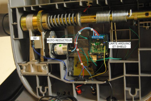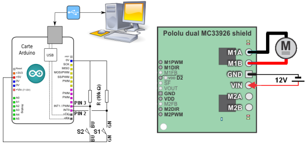 Les détecteurs (de même que le moteur) sont reliés à une carte électronique de type ARDUINO UNO. La carte Arduino[1] supporte un shield[2] (carte de puissance Polulu dual MC33926[3] destinée à l'alimentation de deux moteurs à courant continu). Ici une moitié seulement du shield est utilisée.
