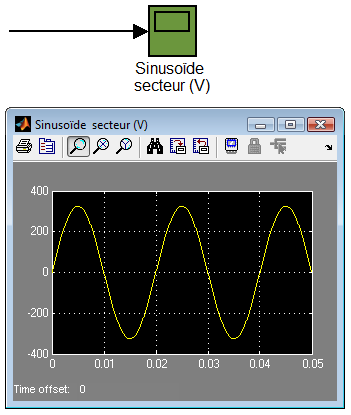 oscilloscopes (Scope) : DOUBLE CLIQUER sur le Scope pour afficher l'écran de l'oscilloscope (fenêtre pop up), le scope dispose d'au moins une entrée mais peut afficher de nombreuses grandeurs physiques en concordance de temps.