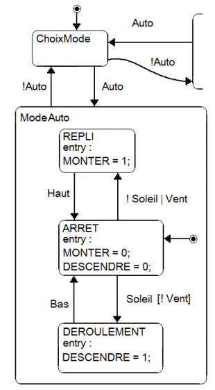 Le mode Auto contenant trois autres états, l'état actif à l'entrée (ici « ARRET »
